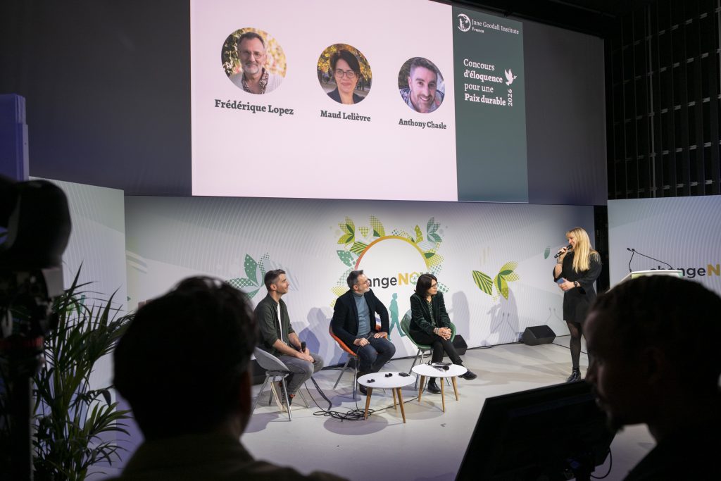 Cette finale s’est ouverte avec les interventions inspirantes de Frédéric Lopez (ambassadeur du JGI France), Maud Lelièvre (Vice-Présidente du JGI France) et Anthony Chasle (Responsable Engagement du JGI France). Ils ont rappelé l’importance de l’action de la jeunesse, l’espoir que soulève en eux ces finalistes et l’engagement du Jane Goodall Institute France auprès de 35 000 jeunes impliqués dans notre programme Roots & Shoots.