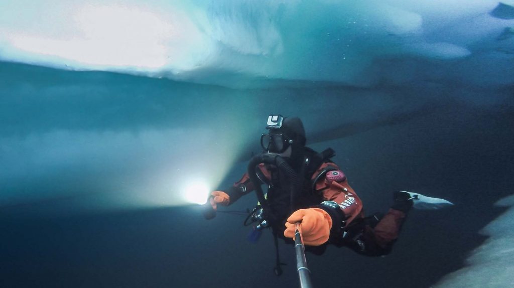 Alban forma les membres de l’expédition à la plongée sous glace lors du bivouac à proximité du lac d’altitude. Quant à Robin, il guida l’équipe du camp de base au lac avec des pulkas tirées par des chiens nordiques avec des missions en géomorphologie et glaciologie avec les chiens», Maël, 13 ans.